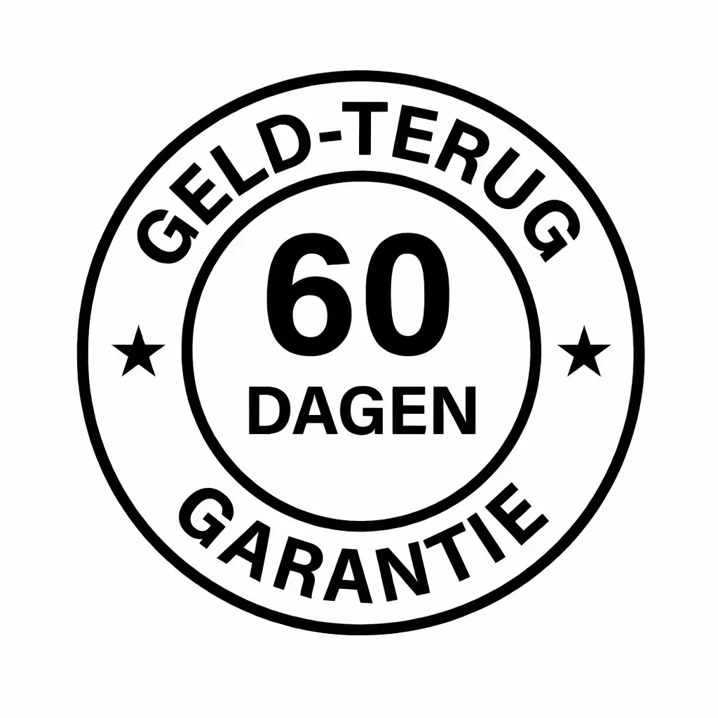 Bent u niet tevreden met het product, dan kunt u binnen 60 dagen na aankoop contact met ons opnemen. Wij storten het volledige aankoopbedrag terug, zonder verdere vragen.